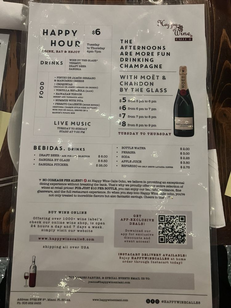 With live music enhancing the atmosphere, it’s an excellent spot for dates and gatherings. The attentive service and impressive wine selection, including Moet Chandon specials, further elevate your experience. Whether for lunch or a lively dinner, Happy Wine Calle Ocho promises a memorable evening surrounded by good vibes and great flavors.
